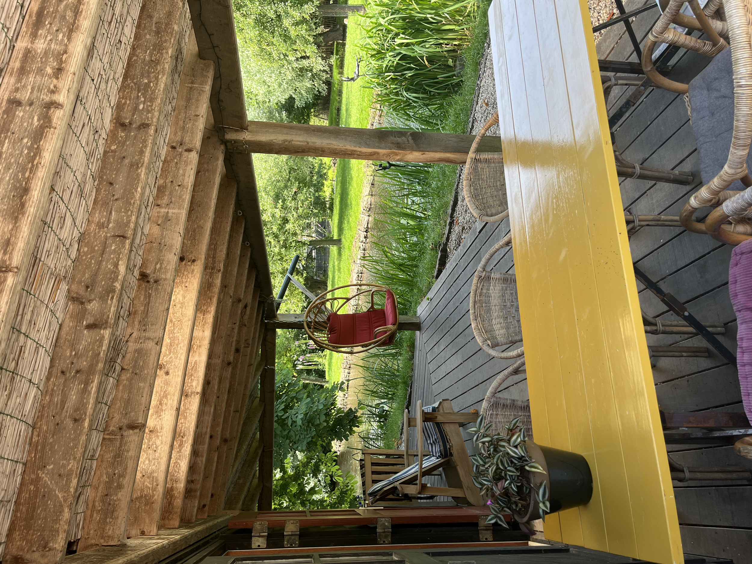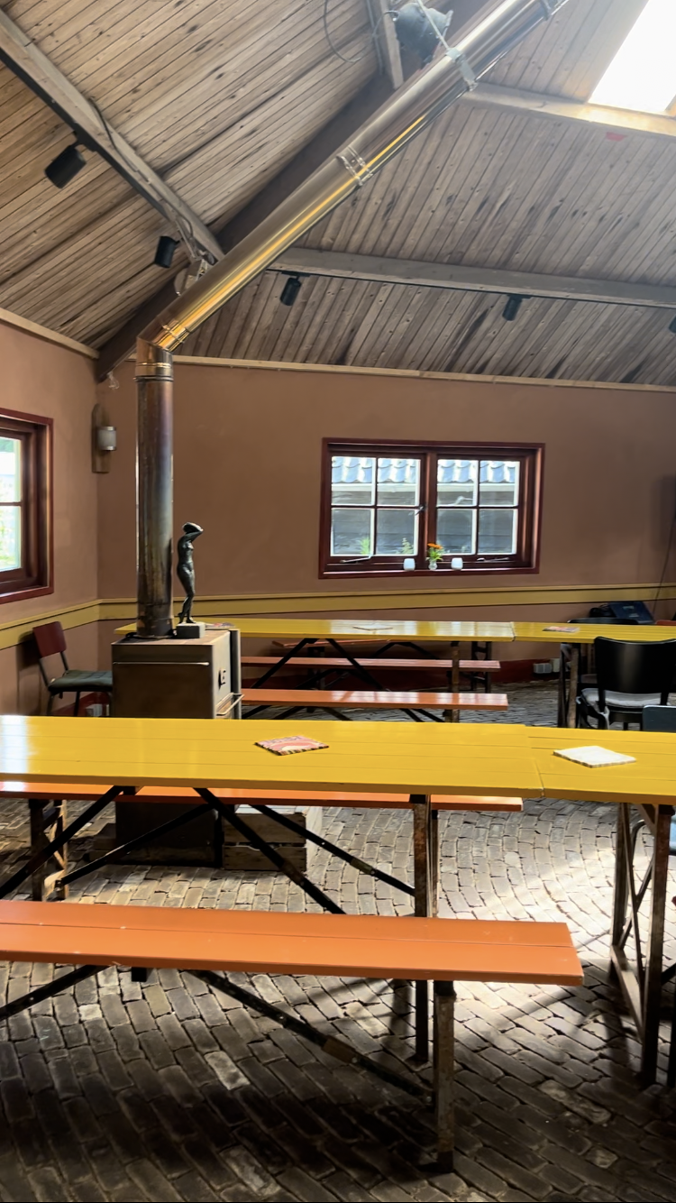 De kunststudio, de voormalige hooischuur, is een gezellige ronde ruimte met veel raampjes, een stenen vloer en een houtkachel.